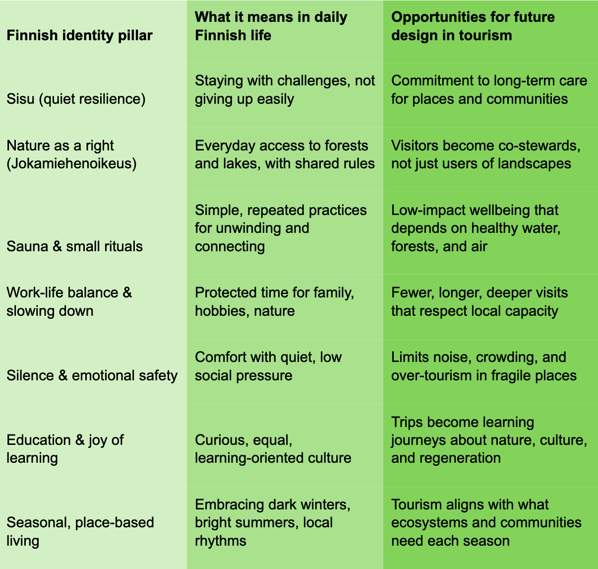 Most tourism marketing still leans on hedonic promises: comfort, fun, escape from reality. The Finnish story is different. Rooted in sisu, nature connection, modesty, and well-designed public services, it communicates the message: 'here, life is organised so people can live in line with their values'. For a visitor, the offer is not simply "come and relax," but "come and experience how it feels when a whole society is built around enough trust and balance." The promise shifts from entertainment to alignment: travellers are invited to feel not only better but also more purposeful.